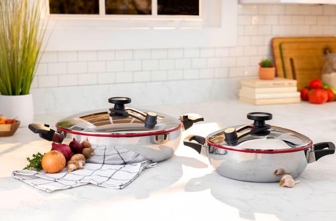 Aro Silicromático™: Sella mejor los vapores para cocinar con menos grasa o agua añadida en comparación con nuestras ollas tradicionales de cierre de metal.